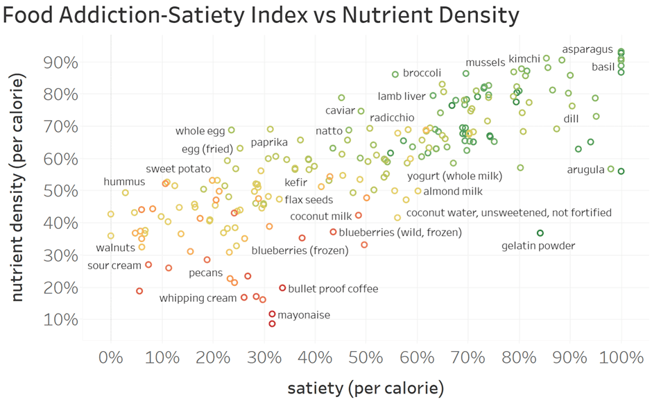 For those who want all the data, we have just published an interactive chart showing the location of all 8,535 foods in the USDA database on the spectrum of satiety vs. nutrient density, which you can view here.