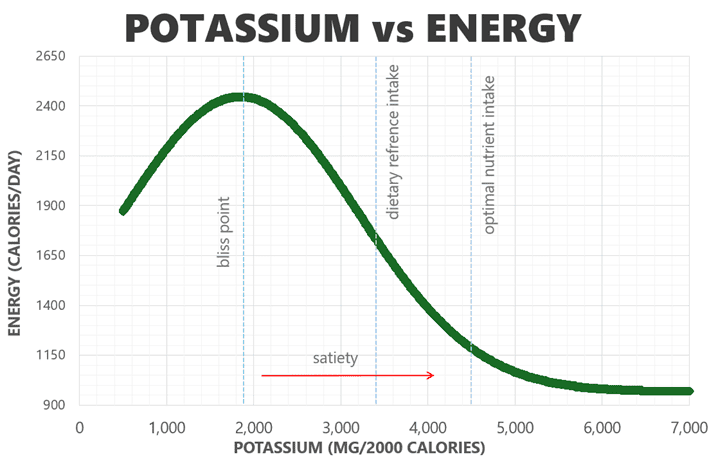 We also don’t fortify our foods with potassium, so potassium is likely a signature of minimally processed, nutrient-dense whole foods. As shown in the chart below, the data reveal a bliss point for potassium of around 1800 mg per 2000 calories. To the right, we can see that we eat much less foods with a higher potassium concentration as sensory-specific satiety sets in.