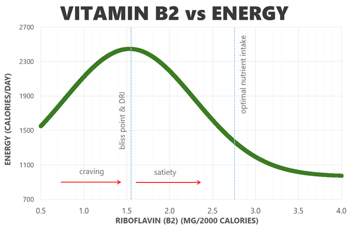 It’s not that adding a multivitamin with a ton of B2 to make your pee bright yellow will boost satiety if you’re eating nothing but McDonald’s. Still, the data indicate a bliss point for foods containing B2, which aligns with the Dietary Reference Intake. Moving towards the Optimal Nutrient Intake of 2.75 g of B2 per 2000 calories aligns with eating significantly less.