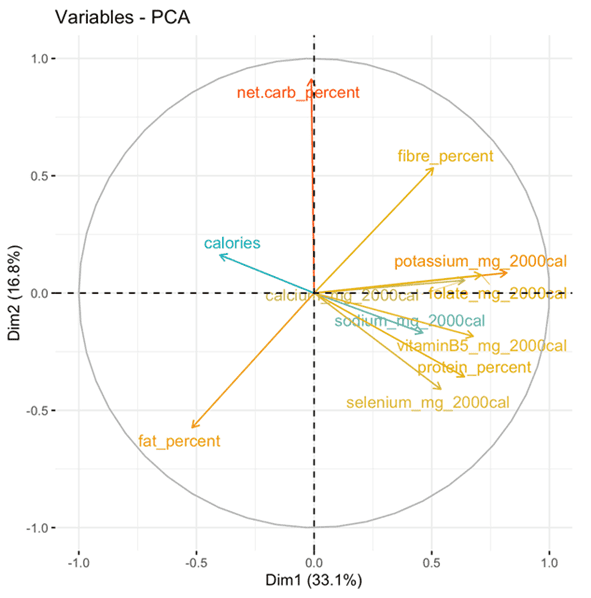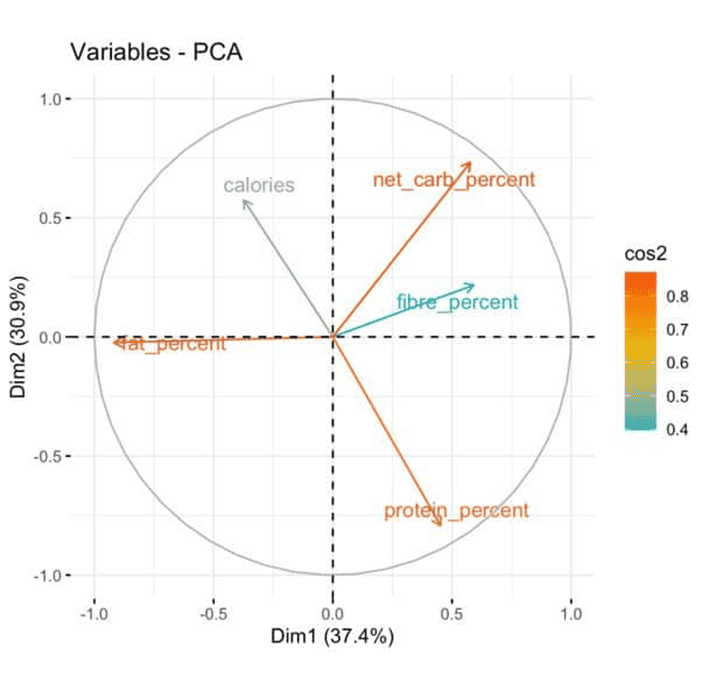 The chart below shows a simplified PCA that only considers calories, protein, fibre, carbs, and fat. Notice how protein percentage is diametrically opposed to calorie intake, meaning that if you want to reduce calories, you should prioritise higher protein percentage foods. Meanwhile, foods that contain more fat and carbohydrates also tend to have higher calorie content and less protein.