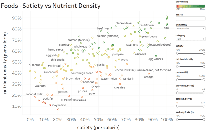 If you want ALL the data, we just published an interactive chart showing where all 8,535 foods in the USDA database sit on the spectrum of satiety vs. nutrient density, which you can view here.