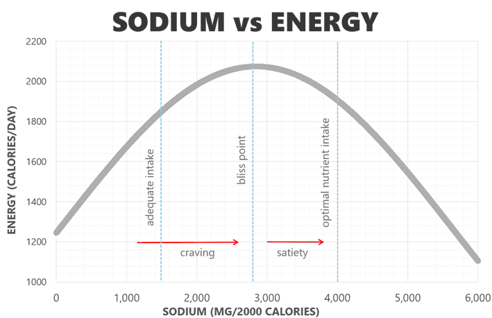 As you can see in the bliss point/satiety chart above, the data shows that we crave, on average, 2.9g of sodium per 2000 calories. Anything with this concentration of sodium will maximise intake.