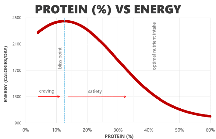 But it doesn’t take much to satisfy our minimum survival needs. Once we get around 12% of our daily energy needs from protein, we stop craving it and seek energy from fat and carbohydrates.